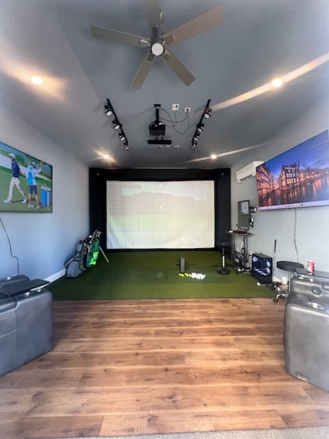 One wall should be just a plain wall, no windows or doors, and that is the wall where the screen for the projector goes. Choosing a shed with lots of height and length is best, as it gives you optimal space for setting up golf bags and having your golf equipment beside you for easy access.